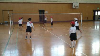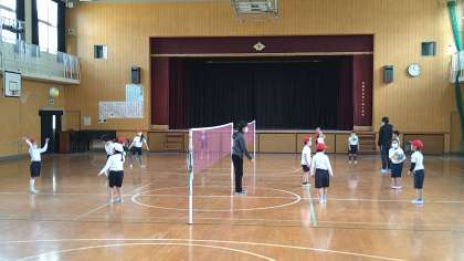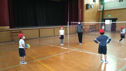 バレーボール型のゲーム遊びです。ボールを味方で落とさないように回してから相手コートへ投げ入れます。まだ、得点はなしでゲームの仕方を学習しています。