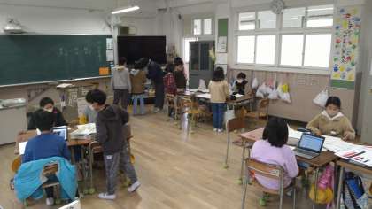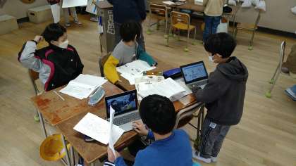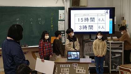 3つのグループに分かれて活動しています。「家での過ごし方」「将来の夢」「公園」についてアンケートをとってグラフに表したり、まとめたりしています。