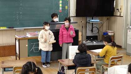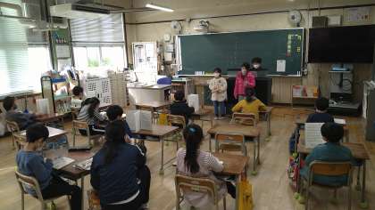 今日歌っている曲は、「にんげんっていいな」です。イベント係の2人の児童は楽器の演奏をしています。このあと席替えをします。