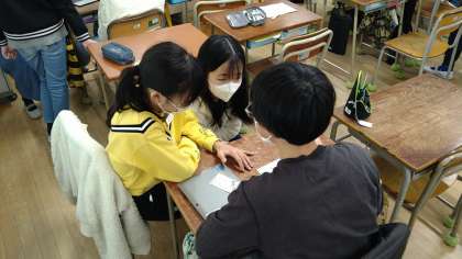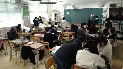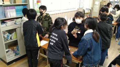 グループごとの出し物の相談(話し合い)をしています。思い出に残る茶話会になるようにしっかりと話し合っています。