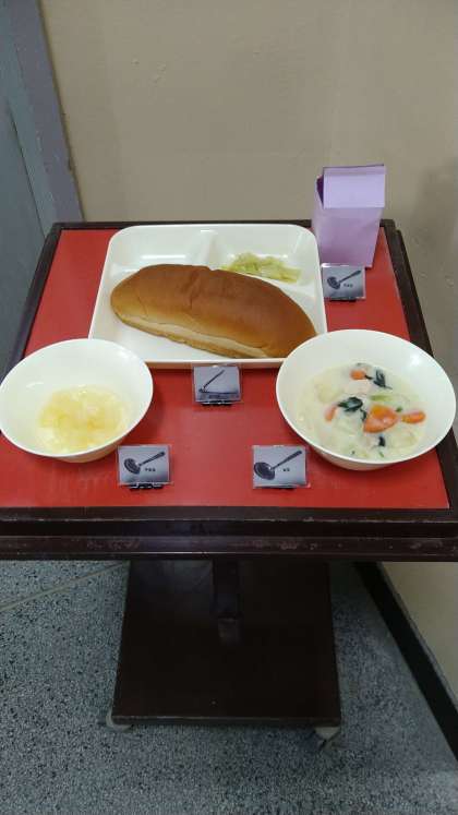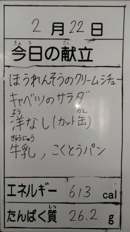 今日の大おかずは「ほうれんそうのクリームシチュー」です。ほうれんそう以外の人参・玉ねぎ・じゃがいもなどの具材もゴロゴロと入っています。