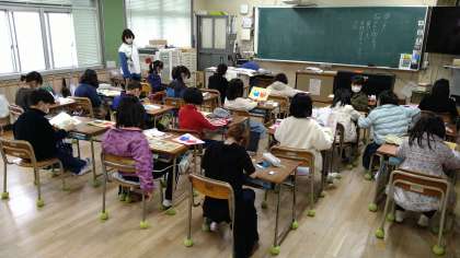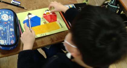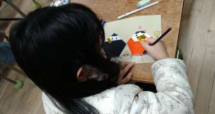お内裏様とお雛様は折り紙で作っています。その2人を若草色の色画用紙に貼って、背景を色鉛筆で描いています。