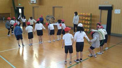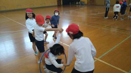 用具を操作する運動(遊び)をしています。グループでフラフープを端から端まで手を使わずに送っています。どのグループが速く送ることができるかは接戦でした。