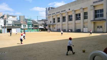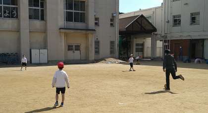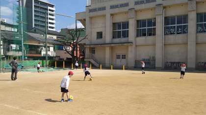 2人1組になってサッカーボールの蹴り合いをしています。東小橋小学校のボールはけがをしにくい外側が柔らかいボールを使用しています。子どもたちは怖がらずに楽しんでいます。