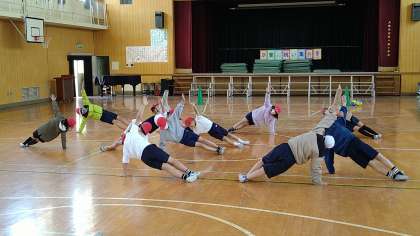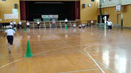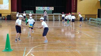 引き続き、体つくり運動をしています。今回は体操やボールを使った用具を操作する運動です。2グループに分かれて競争形式で楽しんでいます。