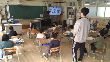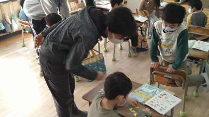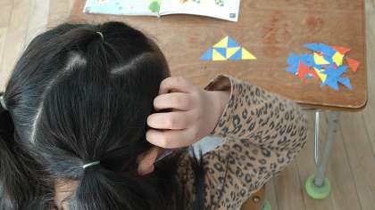 三角形の図形パズルをしています。8枚の三角形を使ってピラミッドを作り、そこから少しずつ変形させていきます。細長い棒の形や正方形へ変形しています。