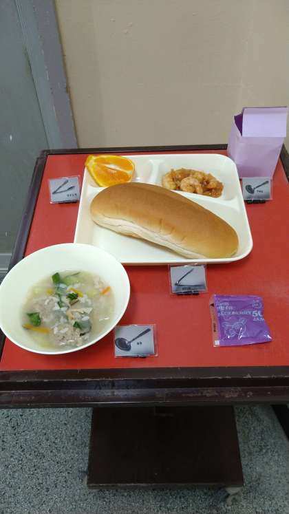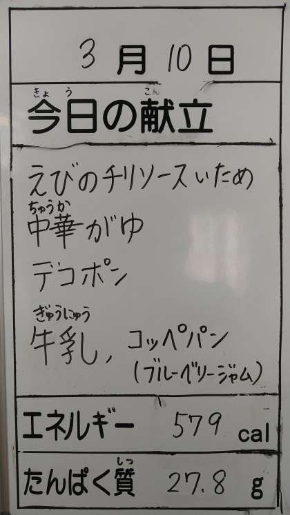 今日の給食は中華風メニューとなっています。「中華がゆ」と「エビのチリソースいため」がおかずとして提供されています。