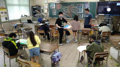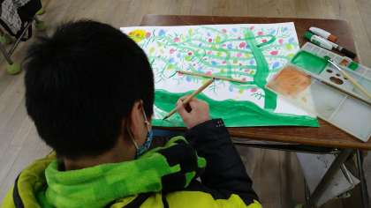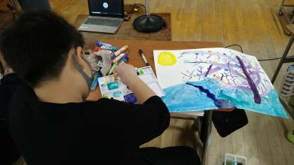 モチモチの木に火が灯っているところを絵で表しています。全6時間の4時間目の様子です。残り2時間で背景を仕上げれば完成します。