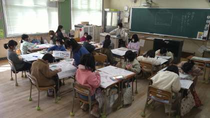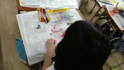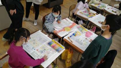 カラーペンを使って思い思いに絵をかいています。作品袋の裏面や机にペンのインクがつかないように間に新聞紙をはさんでいます。人をかいている子どもたちの手足の長さや出始めの部分などバランスよく描けています。
