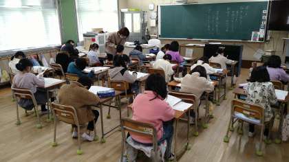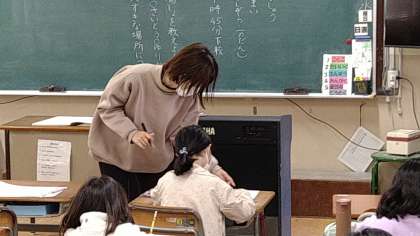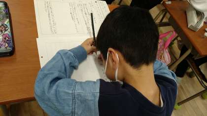 ワークシートにまとめた内容をもとにして原稿用紙に書いています。「おばあちゃんの家」「東小橋公園」「秘密基地」「リビングのこたつ」などの場所について書き進めています。