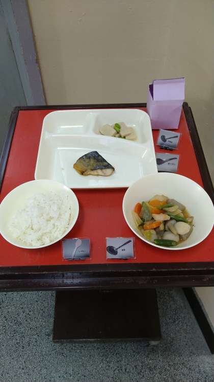 今日は和風メニューとなっています。魚(さごしのおろしじょうゆかけ)、煮物(さといもと野菜の含め煮・高野どうふの煮もの)となります。煮ものは出汁がしっかりきいています。