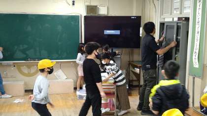 教室の中の移動できるものを動かしてその裏をほうきで掃いたり、ぞうきんで拭いたりしています。「終わった。次は〜。」という声があちらこちらから出ています。