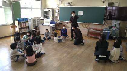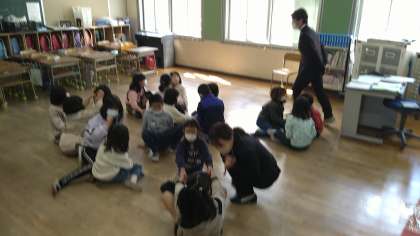 指導者が手を叩いた回数でグループをつくり、名前や好きな食べ物を話す簡単なゲームをしています。