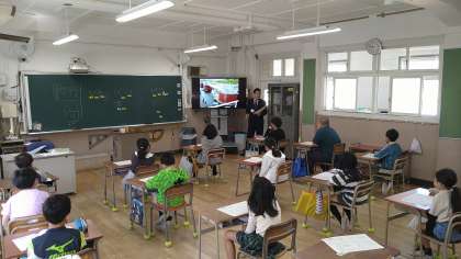 遠足や社会見学の話に興味津々です。浄水場や津波高潮ステーション、科学館などについて画像を見せながら話をしています。