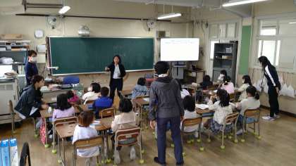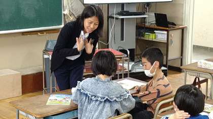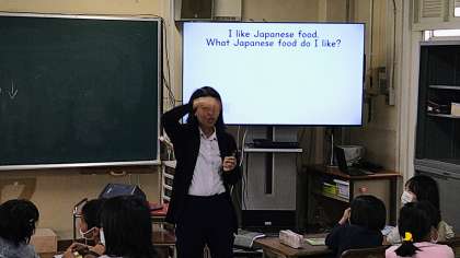 3年から週1時間で始まりました。C−NET(ネイティブスピーカー)は、ミシェル・サウル先生です。自己紹介をかねたクイズを楽しんでいます。