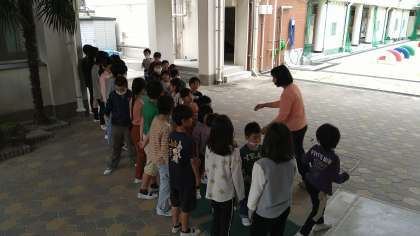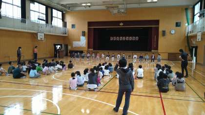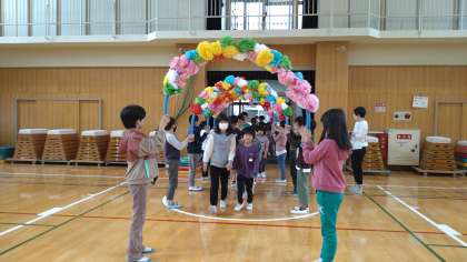 入場は6年生に手をつないでもらっています。2から5年生は講堂の中で待ち、大きな拍手で1年生を迎えています。