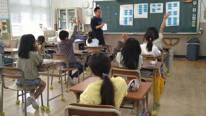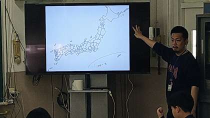 大型モニターに日本地図を映し出し、子どもたちが知っている都道府県を発表しています。3年の終わりの春休みに、自由課題として都道府県を調べていたので、積極的に発表しています。