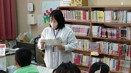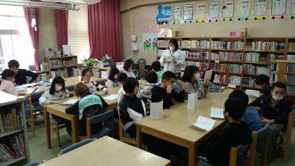 今年度初めて図書館を利用しています。貸出と返却、図書館でのマナーなどを学校図書館司書の松下さんよりお話していただいています。