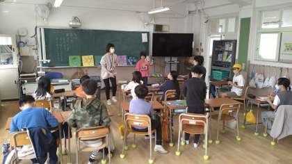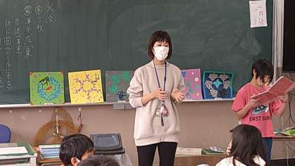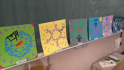 35cm四方の折り紙を三角形におり、さらに三角形の三つ折りにします。次に好きな文字(1から3文字)を書きその文字を切り取り、同じ大きさの色画用紙に貼り、周りを飾りつけています。個性豊かな作品が仕上がっています。