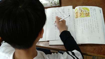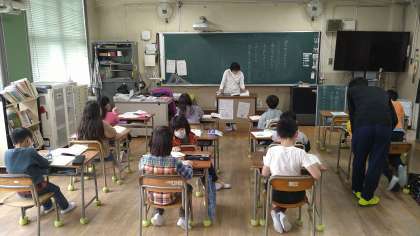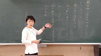 物語に出てくる登場人物の発表をしています。「風のゆうびんやさん」「おじいさん犬」「おかあさんすずめと子すずめ」などが発表されています。