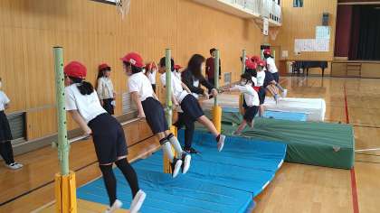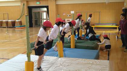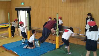 はじめに「つばめ」「ふとん」「前回りおり」をおこなっています。「前回りおり」については、着地する足の位置についてポイントに気づかせています。