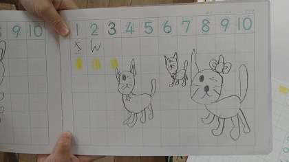 数字とブロックで量感をイメージさせています。算数ノートにブロックの絵を黄色の色鉛筆でかき、自分の好きなものの絵を3つかいています。