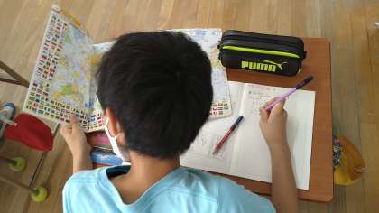 地図帳の最後のページに載っている世界地図と国旗を見て探しています。「ジンバブエ」「スリランカ」「キリバス」「カナダ」の国旗に描かれている動植物を見つけています。