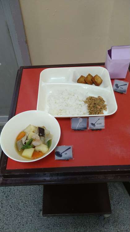 小おかずに「あつあげのしょうゆだれかけ」が提供されています。焼き物機の蒸し焼きモードで焼かれています。味付けは砂糖・みりん・濃口醤油で甘辛く仕上げられています。
