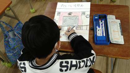 作っているポスターは、探検する部屋の扉に貼ります。ポスターにはその部屋の特徴がわかるように絵をかいています。また、その部屋にまつわるクイズも書いています。