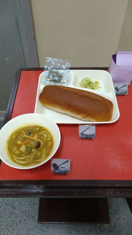 今日の大おかずは「カレースープスパゲティ」です。具材は、ベーコン・鶏肉・にんじん・たまねぎ・ピーマン・しめじが使用されています。
