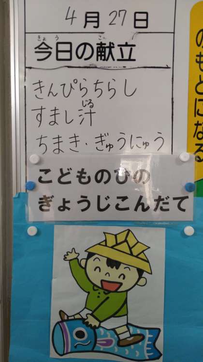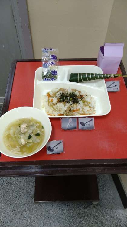 今日の献立は、「こどもの日行事献立」となっています。「きんぴらちらし」と「ちまき」、それと「すまし汁」となっています。