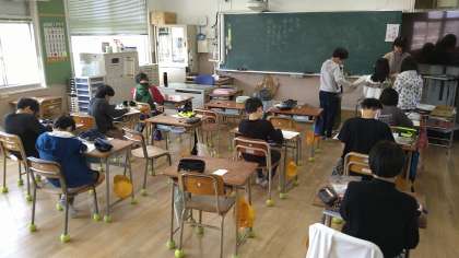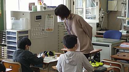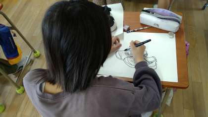 それぞれの児童の履いてきている外靴をデッサンしています。はじめは鉛筆で、そのあと油性ペンでなぞっています。