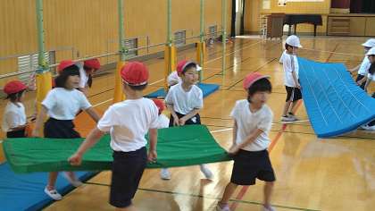 1年の体育は、すべて「遊び」がつきます。さまざまな体育用具を使った遊びをとおして、動きを身につけることをねらいとしています。今日の鉄棒は手でぶら下がったり、足をかけて逆さにぶら下がったりしています。