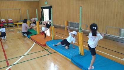 体育館で鉄棒遊びをしています。