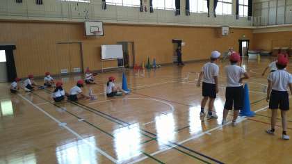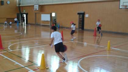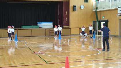 ドリブルしながら走る・コーンを前を向いたまま回る・ミニハードルを跳び越える・フラフープでケンパをするといった動きをリレー形式でおこなっています。