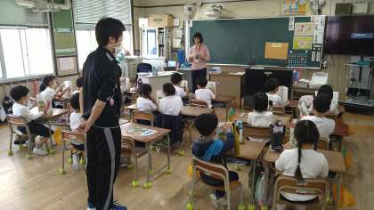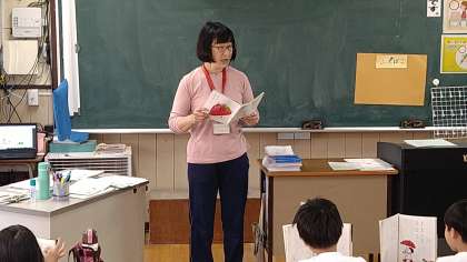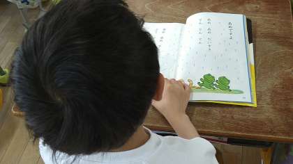 音読を色々な読み方で読んでいます。みんなで一斉に読んだり、1文ずつ交代して読んだりしています。音読は宿題にもなっているので、覚えている子どもたちがたくさんいます。