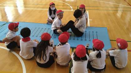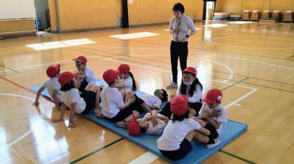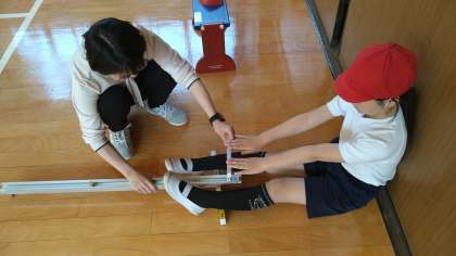 「立ち幅跳び」「上体起こし」「長座体前屈」の練習です。それぞれのやり方や体の動かし方を説明して、実際におこなって来週のテスト期間に備えています。
