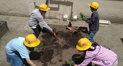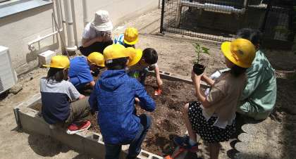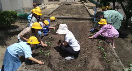 植えている苗は、「さつまいも」「ミニトマト」「きゅうり」「なす」「オクラ」「ピーマン」です。「さつまいも」は大きい学習園、その他の5つは2つの小さい学習園に種類ごとに分けて植えています。