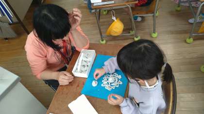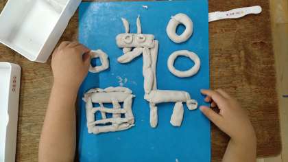 油粘土を手のひらで転がして細長くして文字を作っています。後半は、ひも以外のものでの制作もOKにしています。