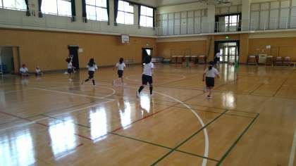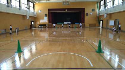今日は体育館で「20mシャトルラン」をおこなっています。2組に分けて計測しています。計測していない時には走っている子どもたちを応援しています。