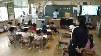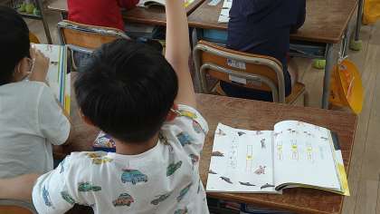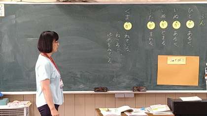 「○○が□□する。」という基本の文づくりをしています。「ねこがたつ。」「いるかがおよぐ。」「すずめがとぶ。」など教科書の絵を見て考えています。