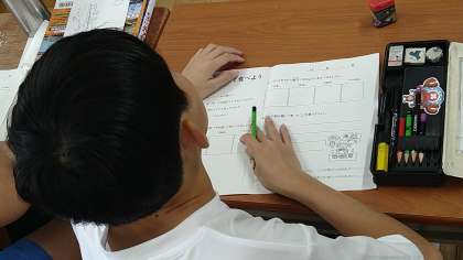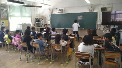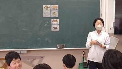 テーマは「栄養バランスを考えて食べよう」です。「主食」「主菜」「副菜」「その他」の4つに分類分けをしています。4つをバランスよくとる大切さについて学習しています。