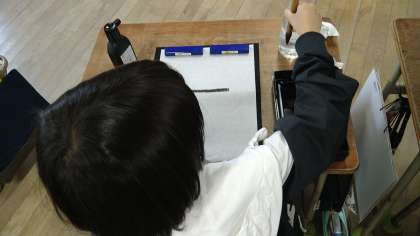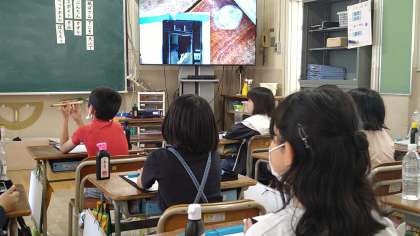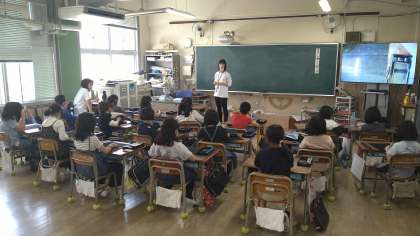 初めて使う用具の説明をていねいにおこなっています。置き場所、置く向きを間違えないように近くの席の児童と確認しあっています。書く時間は少しだけあったので横線(漢数字の一)を書いています。