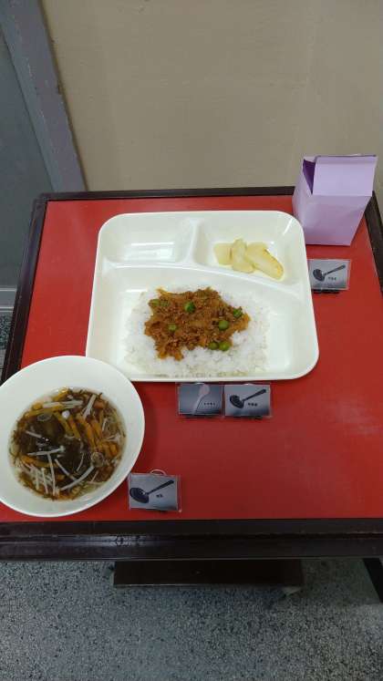 今日のメインは「タコライス」です。具材は、「ひき肉(牛・豚)、たまねぎ、グリーンピース」です。味付けは「塩・こしょう、カレー粉、トマトピューレ、ケチャップ、ウスターソース」を使っています。