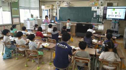 学校や公園などで見つけた生き物をスケッチしています。「何を見つけたでしょうか。」「どこで見つけましたか。」「○○で見つけました。」「□□で見つけました。」などと話型にそって話す練習をしています。
