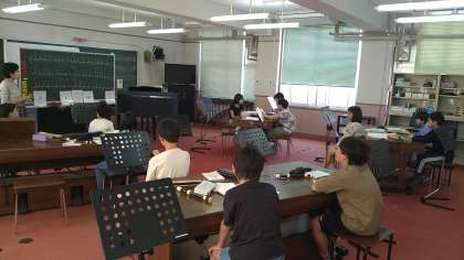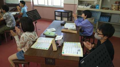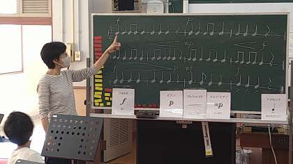 「フォルテ・ピアノ・メゾピアノ・クレッシェンド・デクレッシェンド」の強弱記号の位置を工夫ながらクラップ(手拍子)を楽しんでいます。