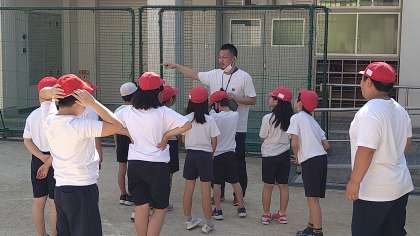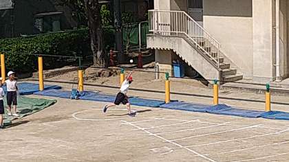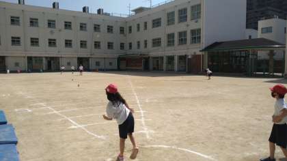 運動場でソフトボール投げを計測しています。何度か練習をしてから、1号のソフトボールを1人2回投げています。日頃からボールを投げる遊びや運動をしている子どもたちは30mを超えています。