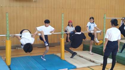 体育館で鉄棒の学習をしています。