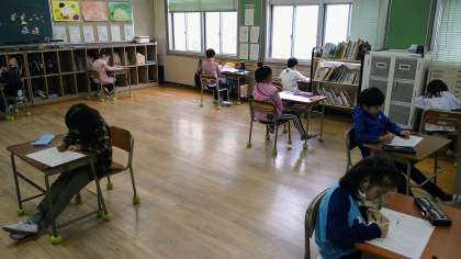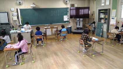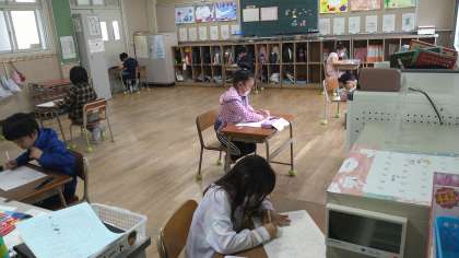 「外国の小学校について聞こう」についてのテストです。テストをおこなう時には、座席の間を広くとっています。集中して問題に取り組んでいます。