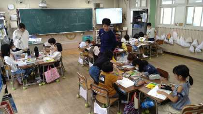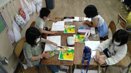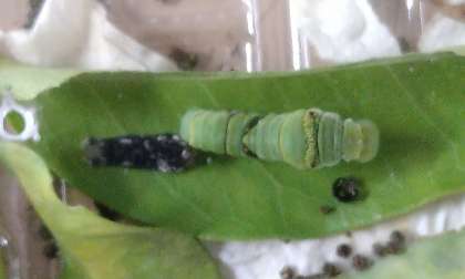 モンシロチョウとアゲハを比べています。これまでに卵の観察をしたので、今日は幼虫の観察をしています。
